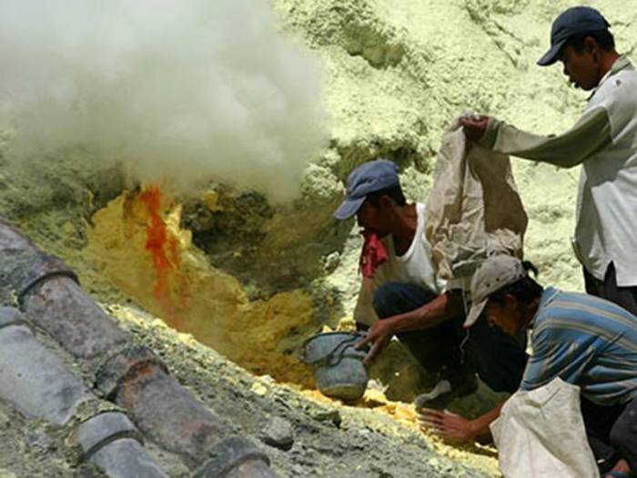 This is an active volcano in Indonesia. Who mine there for sulfur has to scale the 1.6-mile crater to the shore of a 650-foot deep sulfuric crater lake.