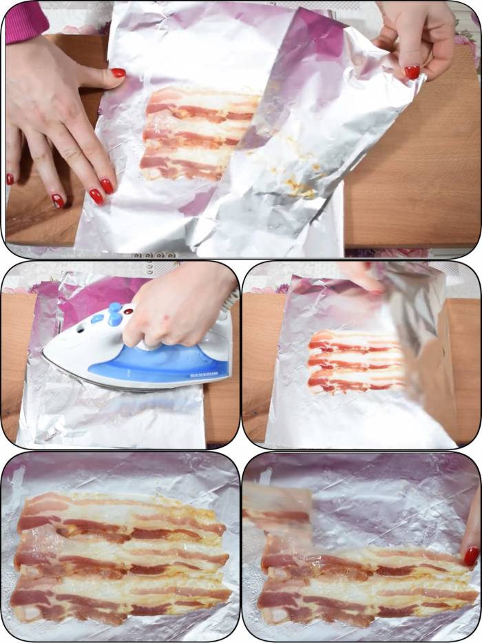 Bake the bacon with aluminium foil and heat of an iron. Interesting!