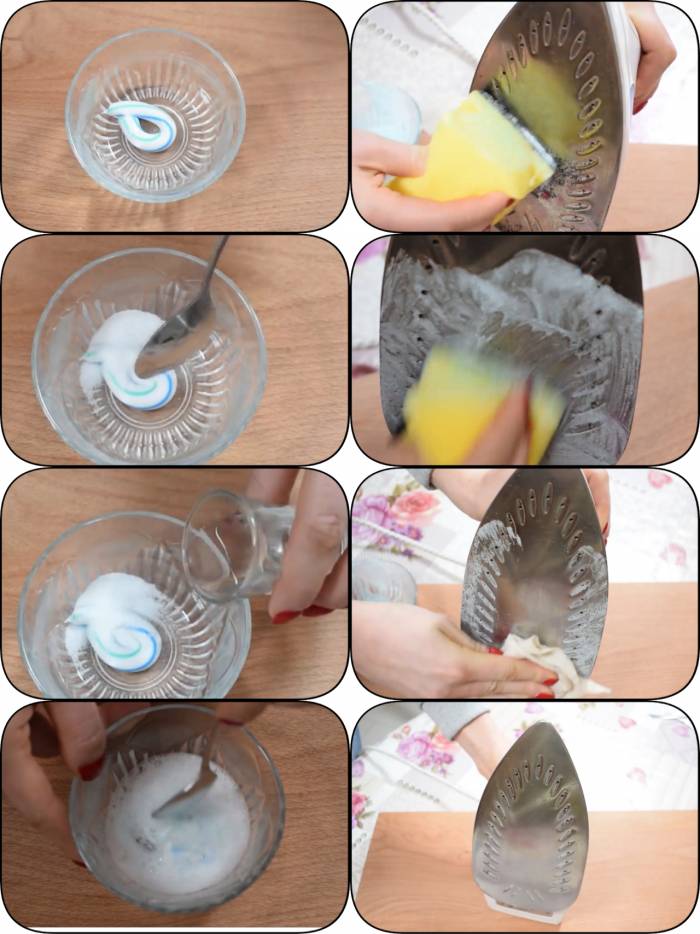 Take toothpaste, baking soda and vinegar. Mix it well, heat the iron to minimum and use this solution to clean your iron. BEST HACK EVER!
