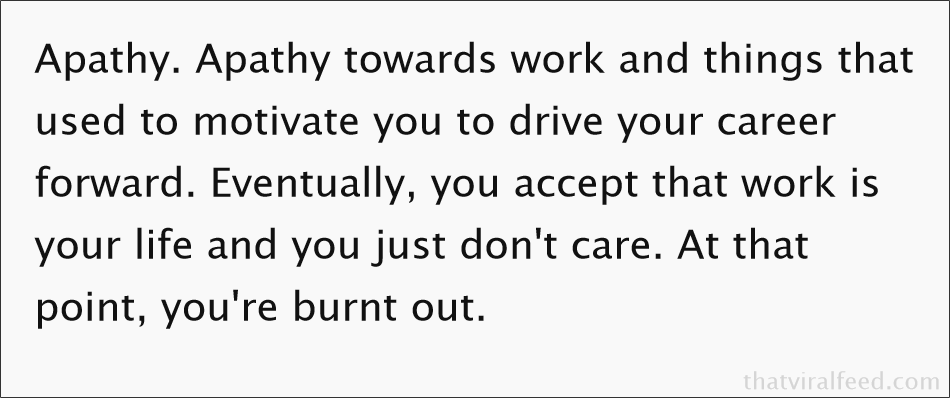 "Apathy towards work and things that used to motivate you to drive your career forward. Eventually, you accept that work is your life and you just don't care. At that point, you're burnt out."