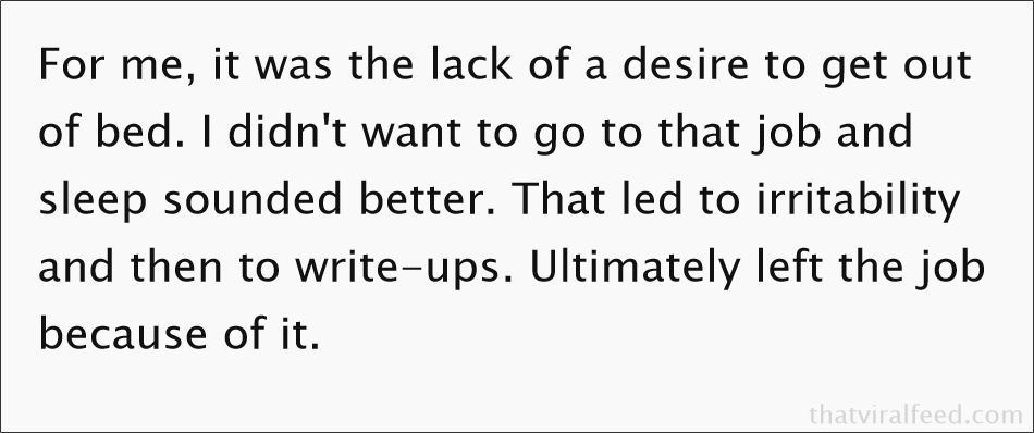 "I didn't want to go to that job and sleep sounded better. That led to irritability and then to write-ups. Ultimately left the job because of it."