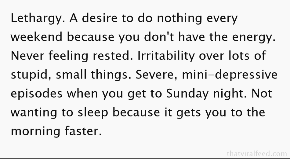 "A desire to do nothing every weekend because you don't have the energy. Never feeling rested. Irritability over lots of stupid, small things. Severe, mini-depressive episodes when you get to Sunday night. Not wanting to sleep because it gets you to the morning faster."