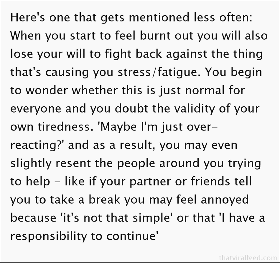 When you start to feel burnt out you will also lose your will to fight back against the thing that's causing you stress/fatigue. You begin to wonder whether this is just normal for everyone and you doubt the validity of your own tiredness. 'Maybe I'm just over-reacting?' and as a result you may even slightly resent the people around you trying to help - like if your partner or friends tell you to take a break you may feel annoyed because 'it's not that simple' or that 'I have a responsibility to continue'"