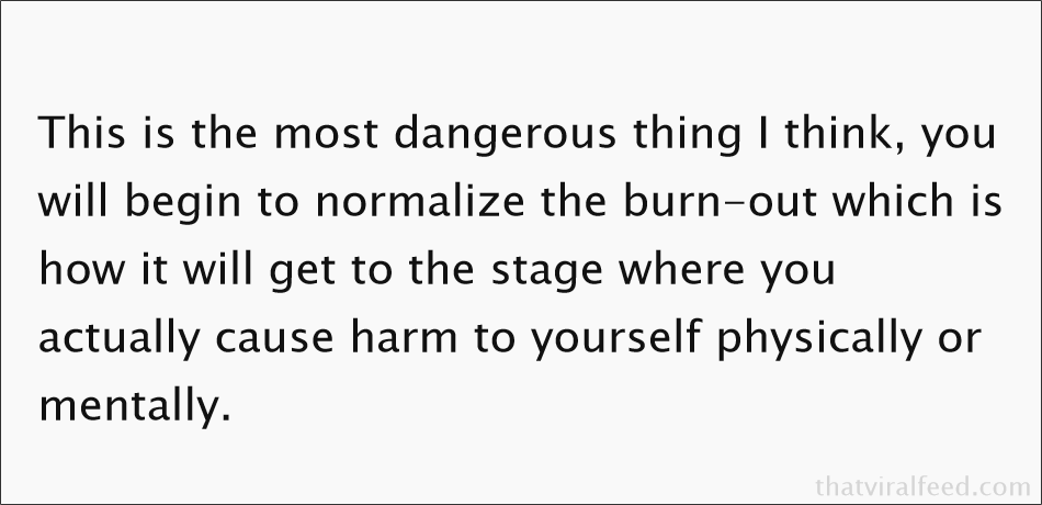 "This is the most dangerous thing I think, you will begin to normalize the burn-out which is how it will get to the stage where you actually cause harm to yourself physically or mentally."