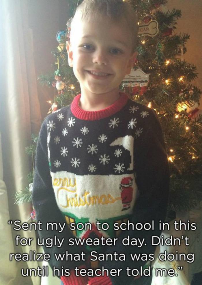 Ugly and utterly ridiculous Christmas sweaters are a staple to the holiday season. At first glance, it is hard to see what might be wrong with this sweater, but when you really, really look at, you can clearly see the problem the school might have had with this young child wearing it.