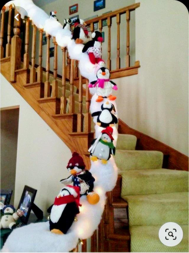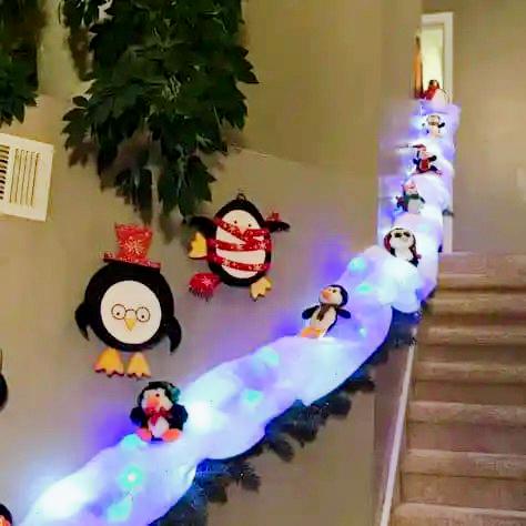 When there is a way to make your banister appear like a snow-covered winter paradise with a family of penguins on their way, there is no need for it to remain empty or covered with the standard decor.