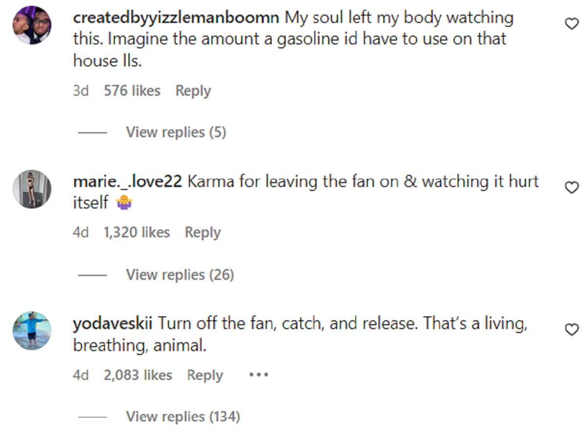Another user commented, "Karma for leaving the fan on & watching it hurt itself."
