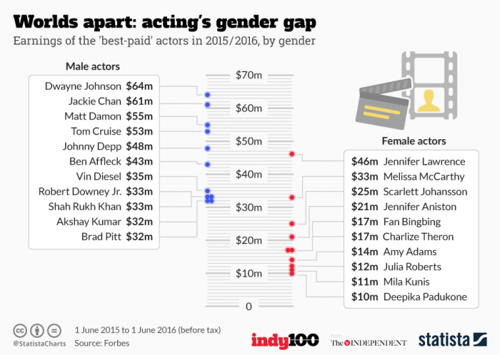 This useful chart by Statista shows the gulf between the sexes when it comes to pay in Hollywood and Bollywood: