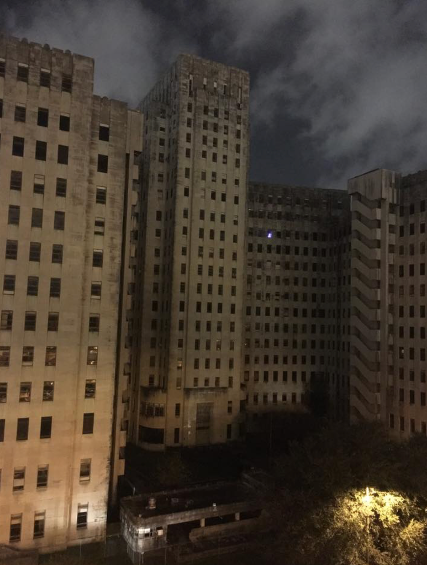 "Charity hospital has been closed, its windows darkened, since hurricane Katrina, and is a gloomy and dreary sight on the best of days... at night it's down-right scary."