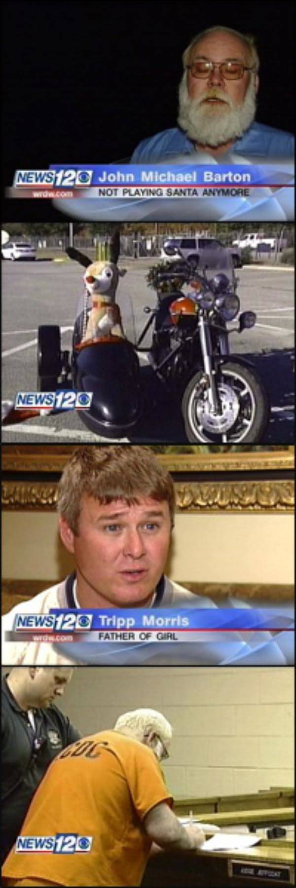 In 2006, a man who played Santa Clause stopped by a South Carolina gas station to fill up his motorcycle with gas when he lured three women over to take a look at hi stuffed Rudolph in the sidecar. John Barton grabbed the oldest sister and took off with her, in the sidecar after the other girls were holding the stuffed toy. The girl's father took off after Barton and hit speeds of over 80mph before the drunken 55-year-old kidnapper let the girl off the bike and went to hide out at a nearby bar. It as later learned that Barton had been dressing as Santa for several weeks and had given other young girls rides on his motorcycle as well.