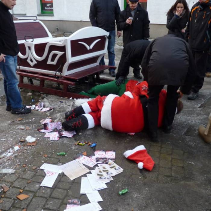 A Santa nad his female helper wound up in the hospital in Poland, in 2013, with concussions after the horses pulling their sleigh became erratic. The pair were playing Santa and his elf at an outdoor market and had real horses pulling their sleigh around. However, on this particular day, they were inebriated beyond belief and were driving the sleigh in and out of traffic. People then began honking their car horns as a few accidents were avoided, when a horse was spooked and went crazy. After a few honks, the horses actually reared up and sent Santa and his helper flying onto the street. The crowd was shocked and the children were devastated.
