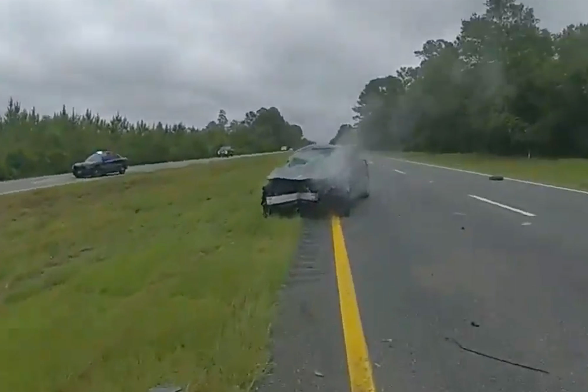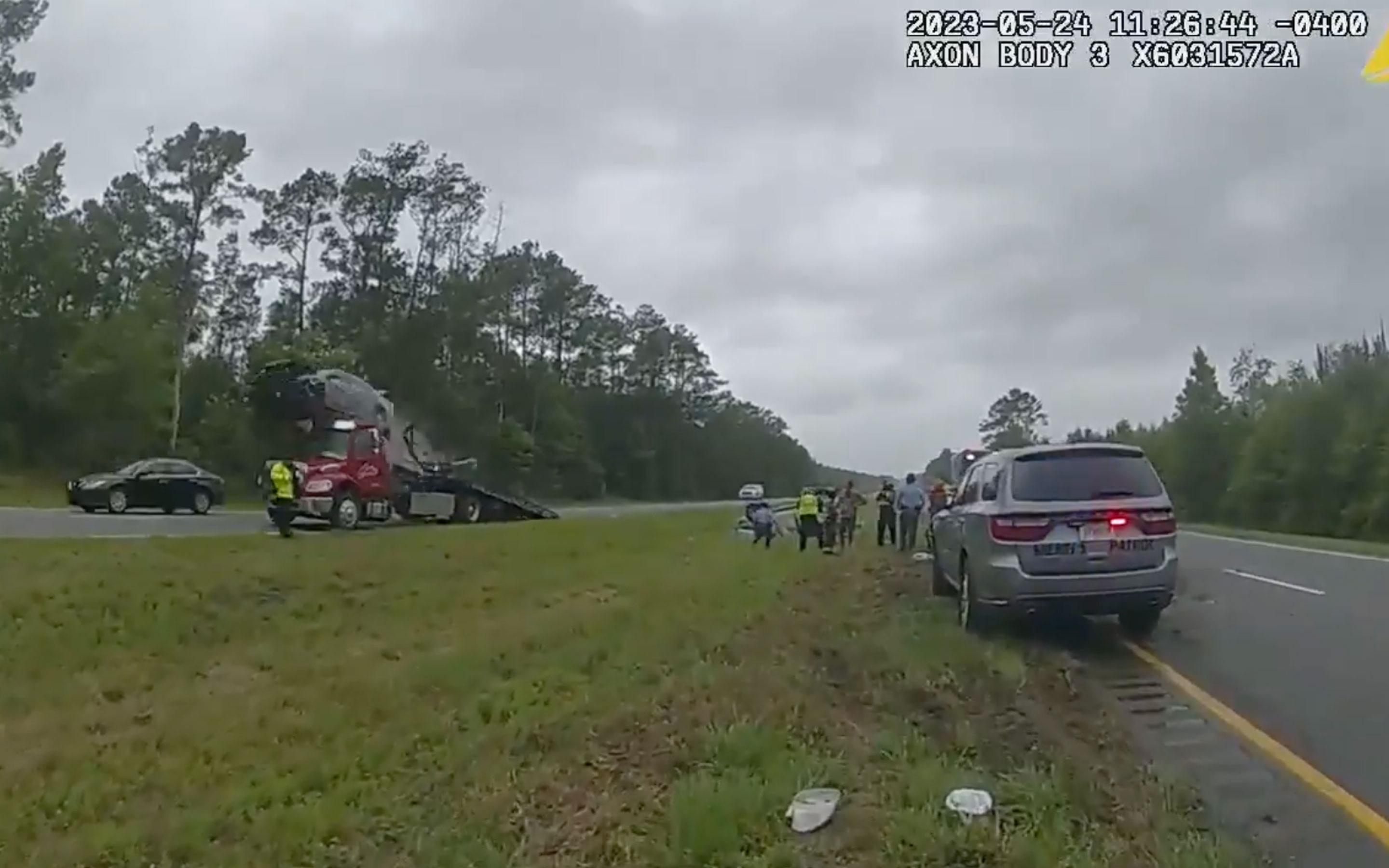 Police are seen in the opening seconds of the video standing on one side of the center median of the road close to what appears to be a flipping vehicle.