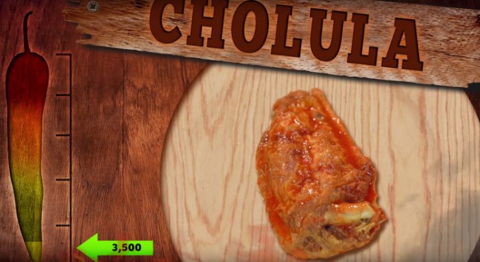 Cholula is the brand of hot sauce used in the test. All of the people eating the wings had no problem with this lovely nugget of deliciousness and ate them without a problem. The number you see is the spiciness level on the Scoville scale, which currently goes from zero to 15,000,000.