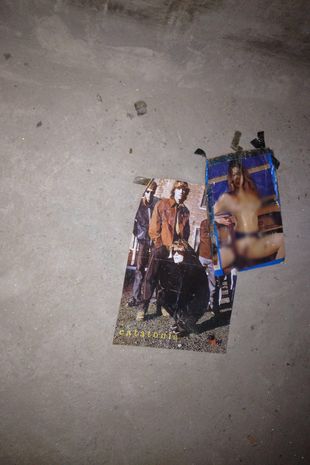 A solitary fold-away chair sat in front of them, facing the tunnel's wall, with a newspaper page depicting a naked woman in an amorous position affixed to the wall above it.
