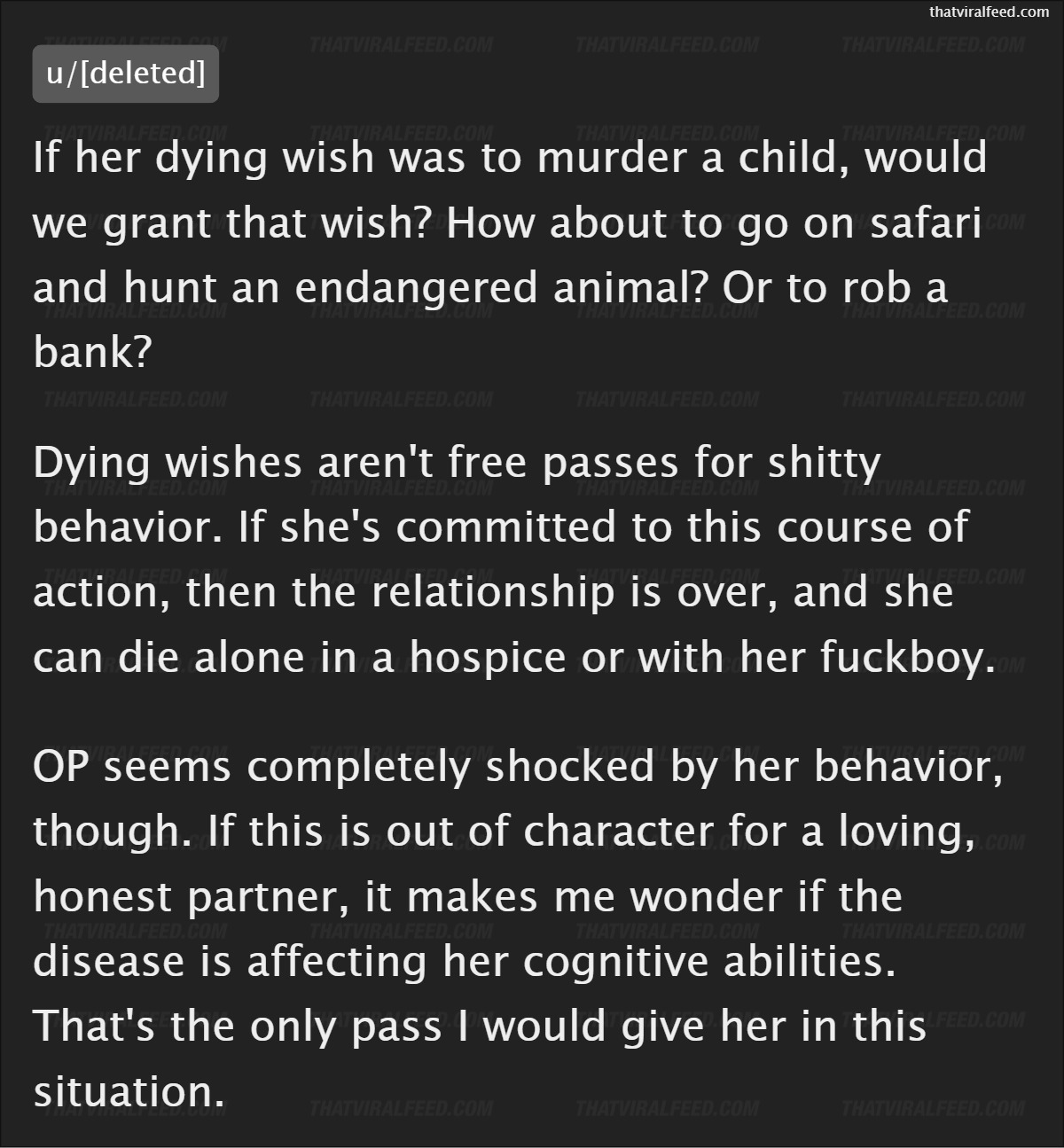 A woman, who was told she only had nine months left to live, made a heartbreaking request to her husband, asking if she could be with her ex one more time.