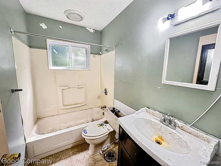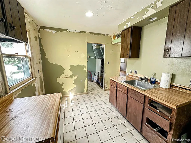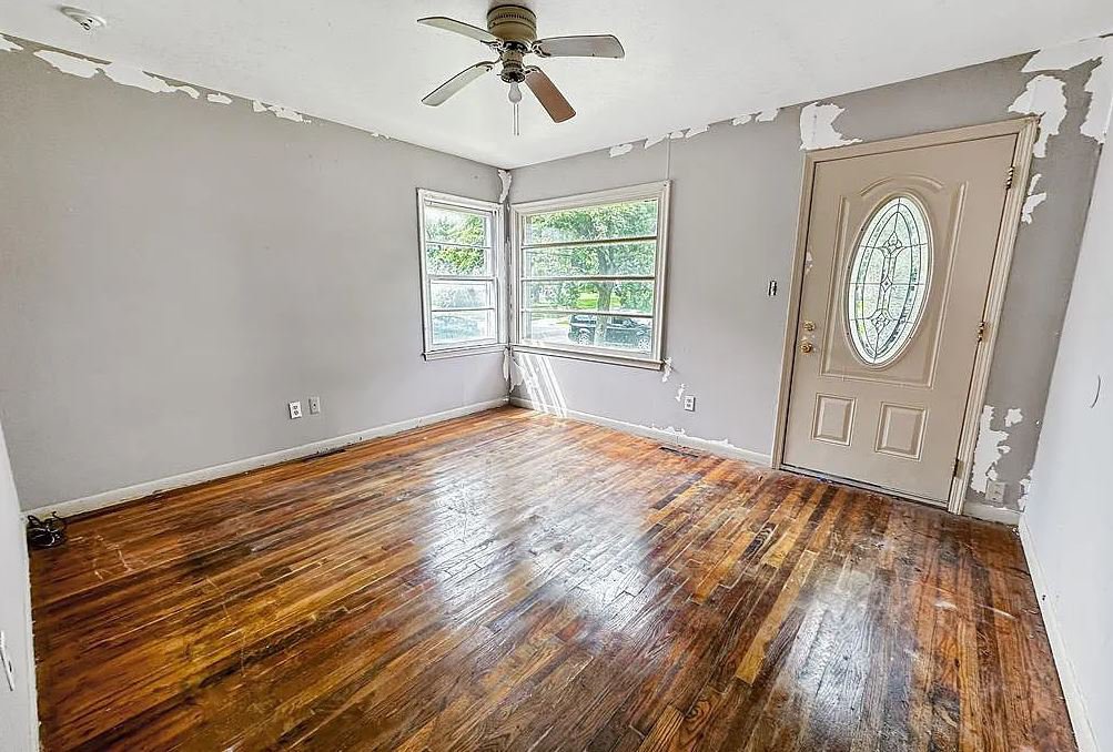 However, because it has been vacant for some time, it has deteriorated. The kitchen cabinets are half cracked, the bathroom fixtures are outdated, and the paint is flaking throughout.